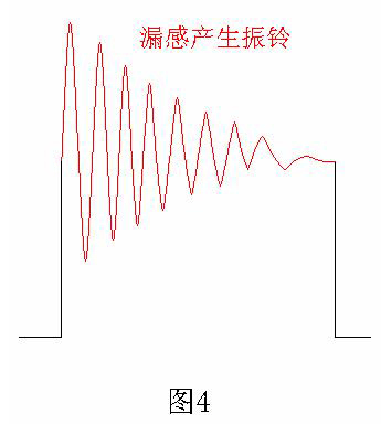 由于变压器的初级有漏感,当电源开关管V1由饱和导通到截止关断时会产生反电动势,反电动势又会对变压器初级线圈的分布电容进行充放电,从而产生阻尼振荡,即产生振铃,如图4所示。变压器初级漏感产生反电动势的电压幅度一般都很高,其能量也很大,如不采取保护措施,反电动势一般都会把电源开关管击穿,同时反电动势产生的阻尼振荡还会产生很强的电磁辐射,不但对机器本身造成严重干扰,对机器周边环境也会产生严重的电磁干扰。